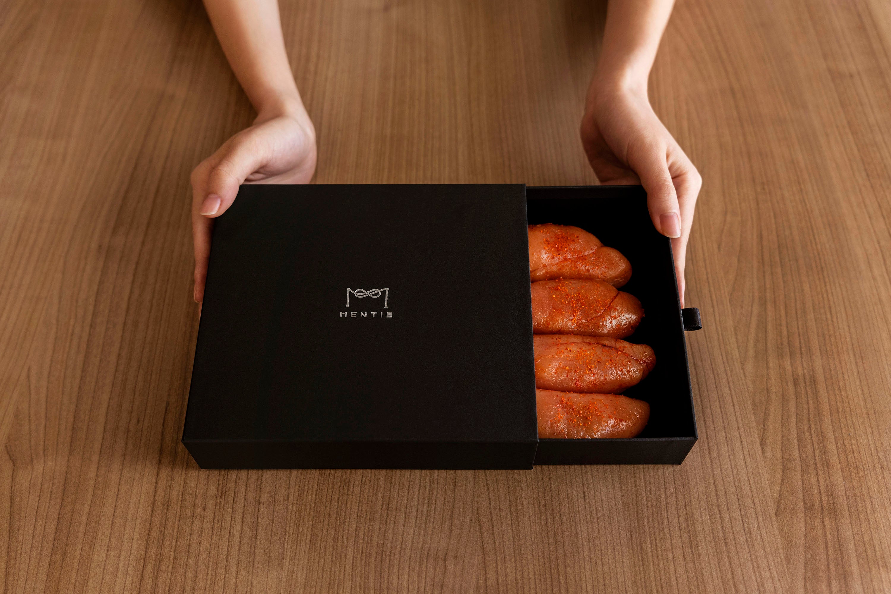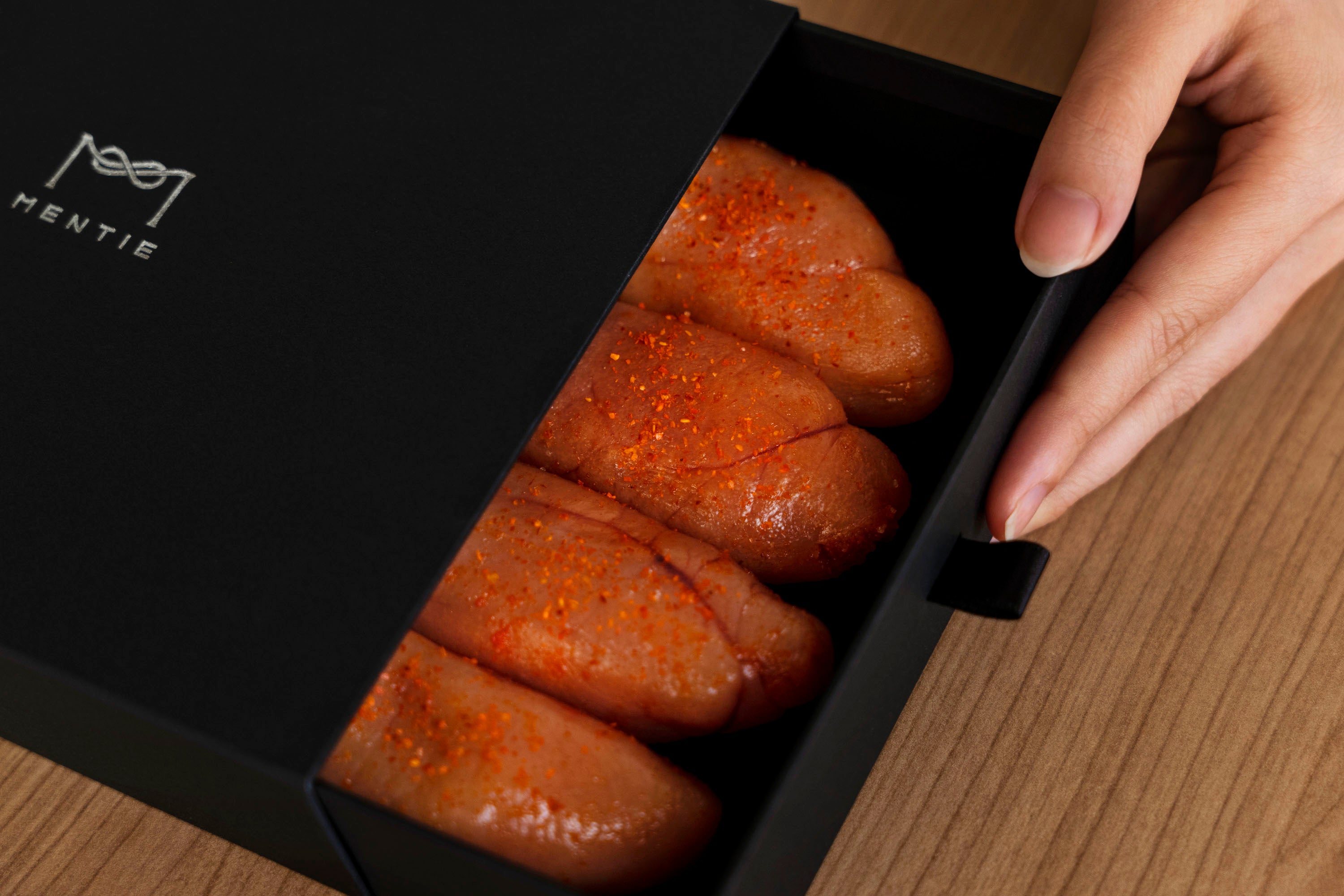 左側の一般的な明太子のサイズに対して、右側のMENTIEはサイズが2倍ほどです。明太子の原材料であるたらこのサイズは個体差がありますが、MENTIEは大きいサイズのたらこだけを使用しております。