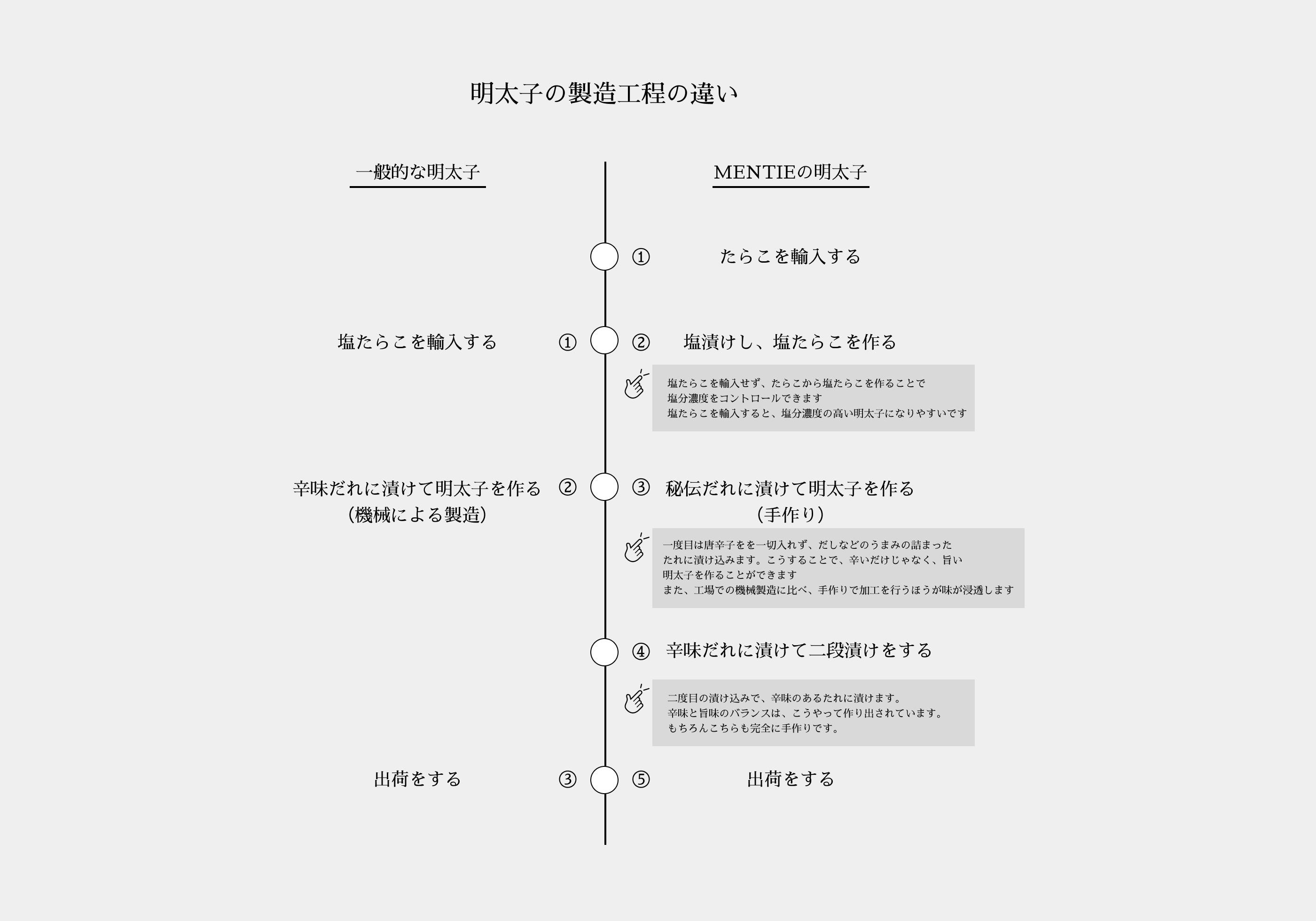 一般的な明太子とMENTIEの製造工程の比較