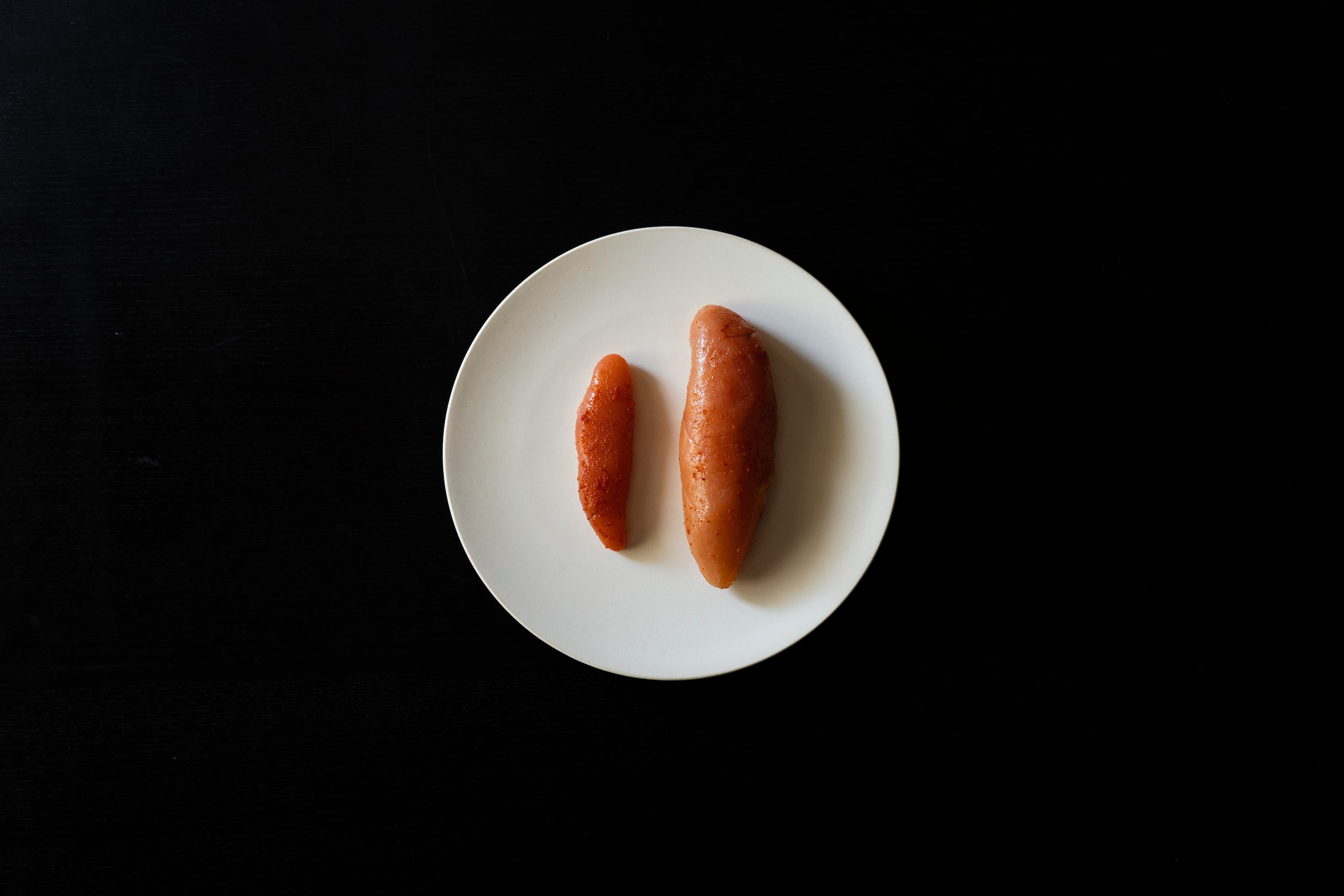 左側の一般的な明太子のサイズに対して、右側のMENTIEはサイズが2倍ほどです。明太子の原材料であるたらこのサイズは個体差がありますが、MENTIEは大きいサイズのたらこだけを使用しております。